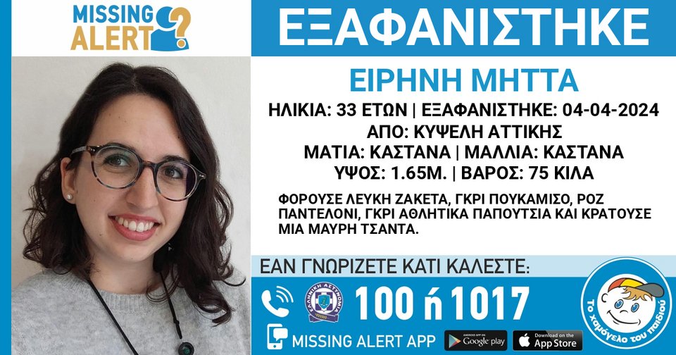 Συναγερμός στις Αρχές για την εξαφάνιση της 33χρονης Ειρήνης Μήττα από τη Κυψέλη.