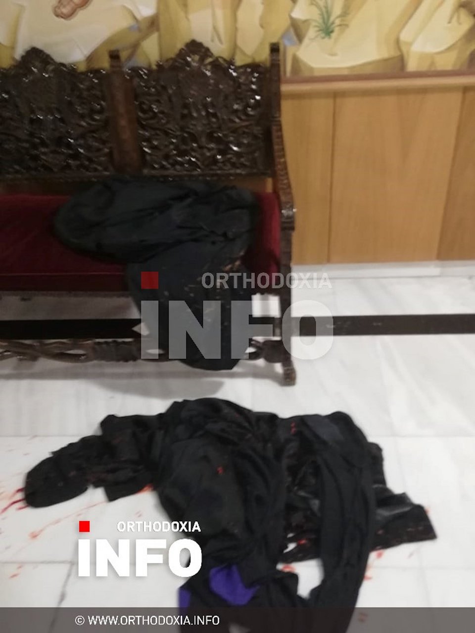 Οι πρώτες εικόνες έξω από την αίθουσα του Συνοδικού Δικαστηρίου δείχνουν το μέγεθος της επίθεσης, με τα άμφια των ιερωμένων να έχουν λιώσει στην κυριολεξία από τη δολοφονική αυτή κίνηση του 37χρονου ιερέα.