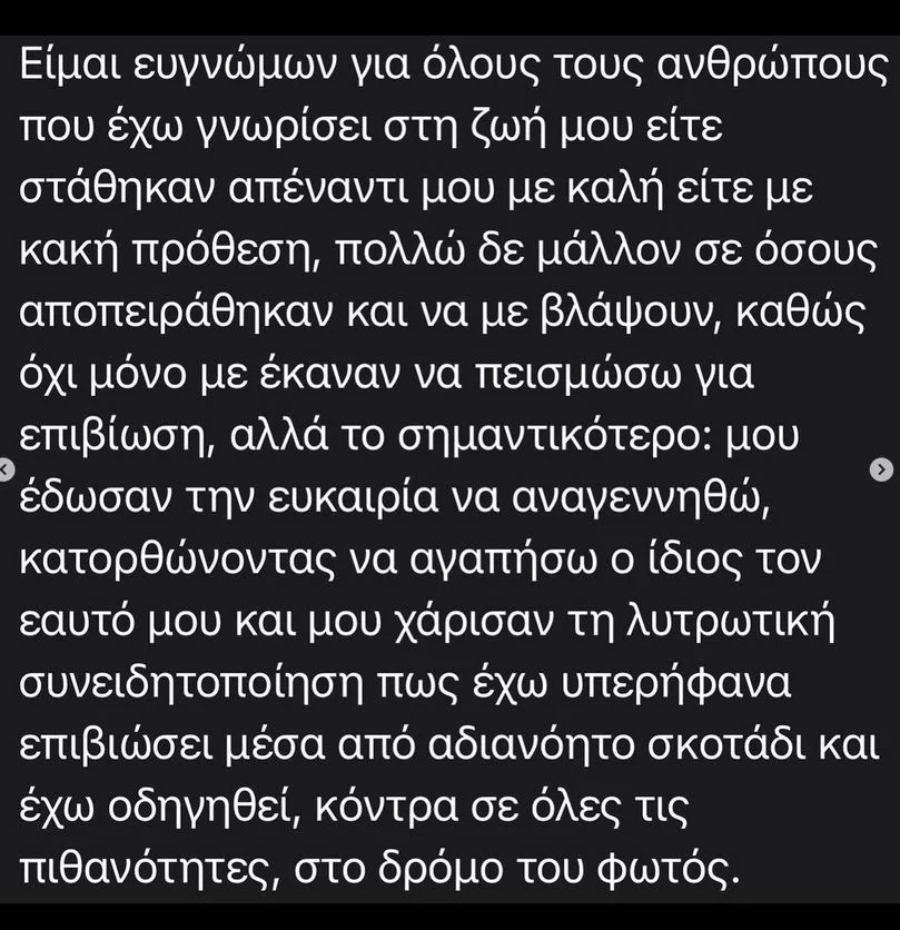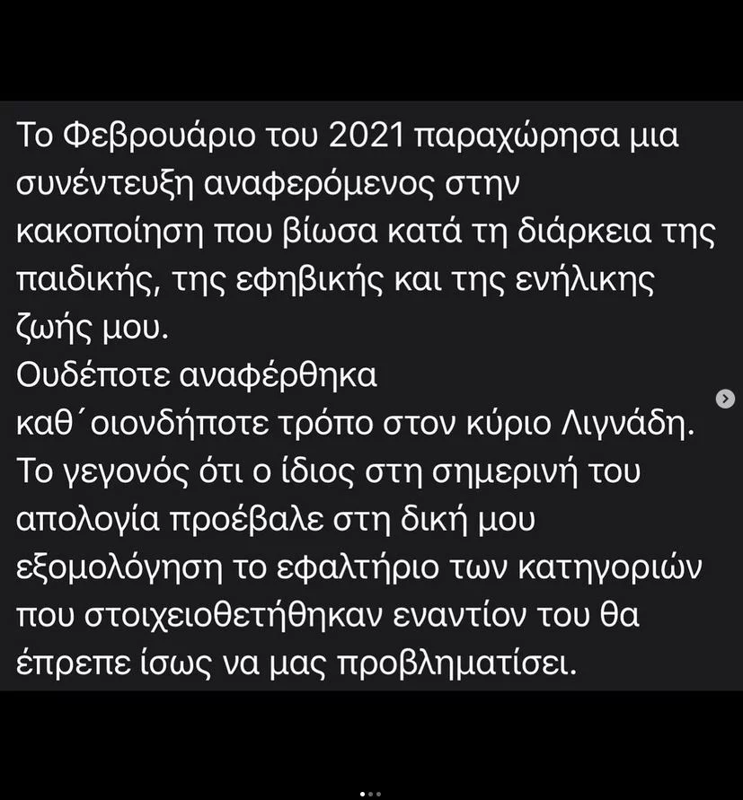 «Τον Φεβρουάριο του 2021 παραχώρησα μία συνέντευξη αναφερόμενος στην κακοποίηση που βίωσα κατά τη διάρκεια της παιδικής, της εφηβικής και της ενήλικης ζωής μου. Ουδέποτε αναφέρθηκα καθ΄οποιονδήποτε τρόπο στον κύριο Λιγνάδη. Το γεγονός ότι ο ίδιος στη σημερινή του απολογία προέβαλε στη δική μου εξομολόγηση το εφαλτήριο των κατηγοριών που στοιχειοθετήθηκαν εναντίον του θα έπρεπε ίσως να μας προβληματίσει. Είμαι ευγνώμων για όλους τους ανθρώπους που έχω γνωρίσει στη ζωή μου είτε στάθηκαν απέναντί μου με καλή είτε με κακή πρόθεση, πολλώ δε μάλλον σε όσους αποπειράθηκαν και να με βλάψουν, καθώς όχι μόνο με έκαναν να πεισμώνω για επιβεβαίωση, αλλά το σημαντικότερο: μου έδωσαν την ευκαιρία να αναγεννηθώ, κατορθώνοντας να αγαπήσω ο ίδιος τον εαυτό μου και μου χάρισαν τη λυτρωτική συνειδητοποίηση πως έχω υπερήφανα επιβιώσει μέσα από αδιανόητο σκοτάδι και έχω οδηγηθεί κόντρα σε όλες τις πιθανότητες, στον δρόμο του φωτός. Αυτός ήταν και ο μόνος λόγος που αποφάσισα να μιλήσω πριν ενάμιση χρόνο. Η προσδοκία να δώσω -παραβλέποντας το ανυπολόγιστο κόστος της προσωπικής έκθεσης- κουράγιο και ελπίδα σε όσους έχουν βιώσει αντίστοιχο πόνο να περάσουν στην αντίπερα όχθη. Είμαι ευτυχής και ήρεμος και το ίδιο εύχομαι από καρδιάς σε όλους».