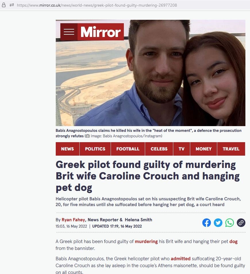 «Έλληνας πιλότος κρίθηκε ένοχος για τη δολοφονία της Βρετανίδας συζύγου Καρολάιν Κράουτς και τον απαγχονισμό σκύλου », αναγράφεται στη Mirror.