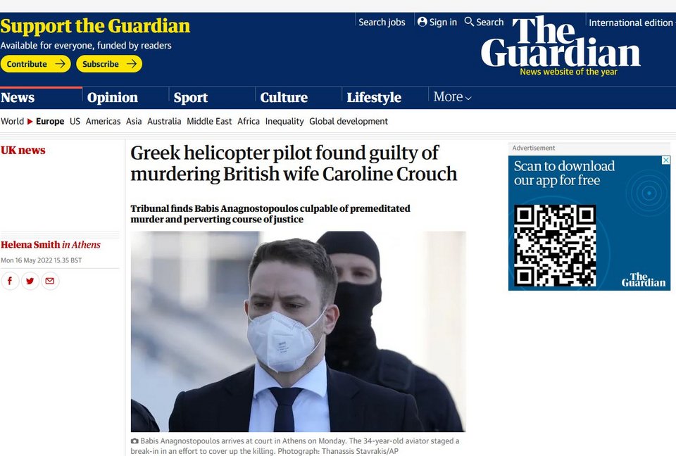 «Ένοχος κρίθηκε ο Έλληνας πιλότος για τον φόνο της Βρετανίδας συζύγου Καρολάιν Κράουτς», αναφέρεται στον τίτλο του θέματος του Guardian.