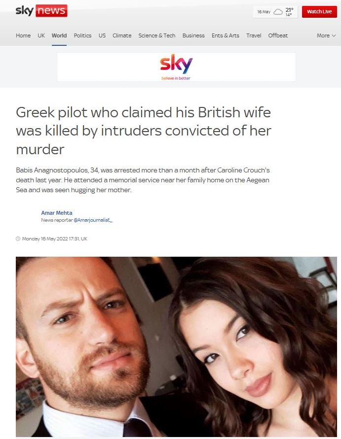 Ο τίτλος στο SkyNews: «Έλληνας πιλότος που ισχυρίστηκε ότι η Βρετανίδα σύζυγός του σκοτώθηκε από εισβολείς, καταδικάστηκε για τη δολοφονία της»