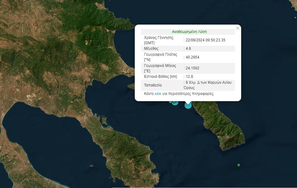 Σύμφωνα με το Γεωδυναμικό Ινστιτούτο Αθηνών, ο σεισμός που σημειώθηκεσ στις 12:50 είχε επίκεντρο 8χλμ δυτικά των Καρυών του Αγίου Ορους και το εστιακό βάθος ήταν στα 12,8χλμ.