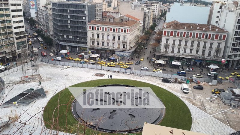 Το σιντριβάνι (διαμέτρου 30 μέτρων, με 13 πίδακες και 188 δέσμες νερού, αλλά και 90 υποβρύχιους προβολείς) τοποθετήθηκε πριν από λίγες ημέρες και σήμερα, Πέμπτη 6 Φεβρουαρίου, ήταν η σειρά του γκαζόν να μπει στην πλατεία Ομονοίας.