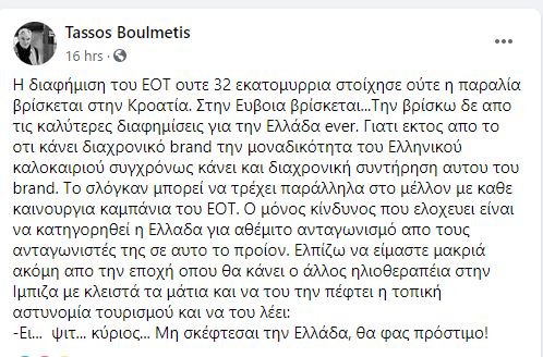 Το δικό του σχόλιο για την διαφήμιση της καμπάνιας για τον τουρισμό έκανε ο Τάσος Μπουλμέτης.