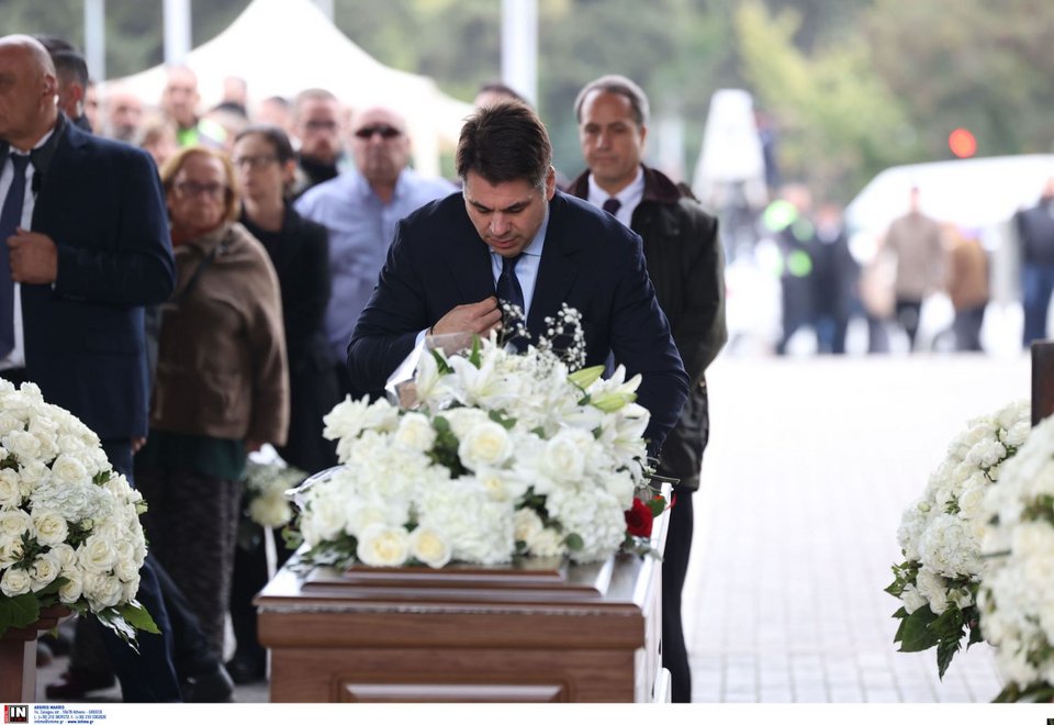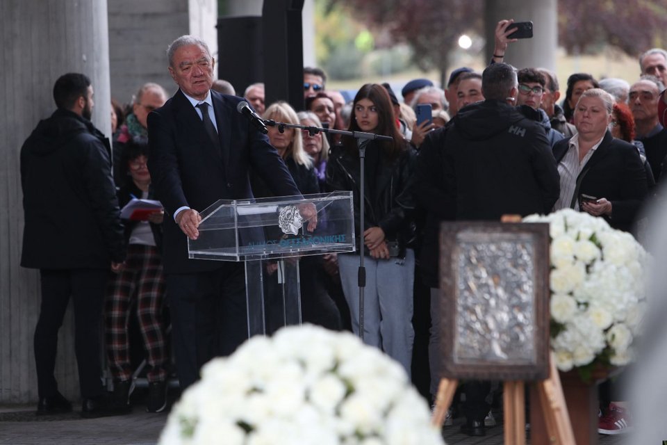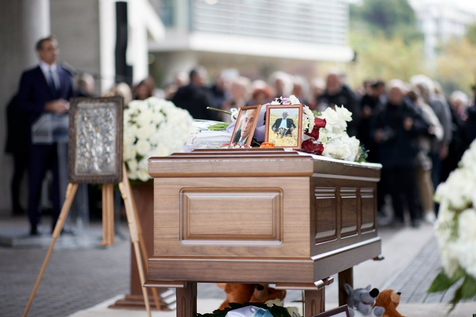 Ο τελευταίος αποχαιρετισμός τελέστηκε, υπό βροχή, και με τη Φιλαρμονική του Δήμου να αποδίδει τιμές παρουσία της Προέδρου της Δημοκρατίας, Κατερίνας Σακελλαροπούλου, του πρωθυπουργού Κυριάκου Μητσοτάκη κι ενός «κύματος» ανθρώπων από όλους τους χώρους που θέλησαν να του πουν το ύστατο αντίο.