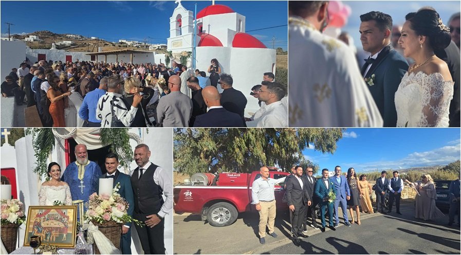 Το μυστήριο τελέστηκε από τον Πρωτοπρεσβύτερο Πέτρο Μαραγκά και τον πατέρα Γεώργιο Κουσαθανά, ενώ η άφιξη του ζευγαριού συνοδεύτηκε από παραδοσιακή μουσική, χαρίζοντας στο σκηνικό αυθεντική κυκλαδίτικη αύρα.