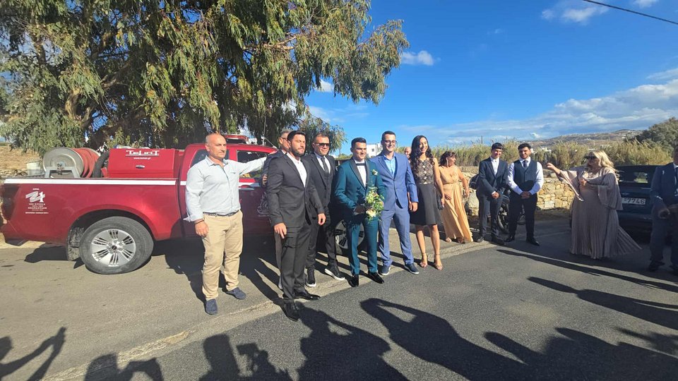 Ο Γιώργος, πυροσβέστης στο επάγγελμα, συνήθως σβήνει φωτιές, αλλά αυτή τη φορά «παραδόθηκε» στη μεγαλύτερη -αυτή της καρδιάς του- από τη γυναίκα της ζωής του, Ειρήνη. Το απόγευμα, πυροσβεστικό όχημα με σειρήνες και φώτα συνόδευσε τον γαμπρό ως το εκκλησάκι, προσφέροντας ένα συγκινητικό και εντυπωσιακό θέαμα. Συνάδελφοί του τον υποδέχτηκαν στην είσοδο και του παρέδωσαν την ανθοδέσμη που προσέφερε στη νύφη.