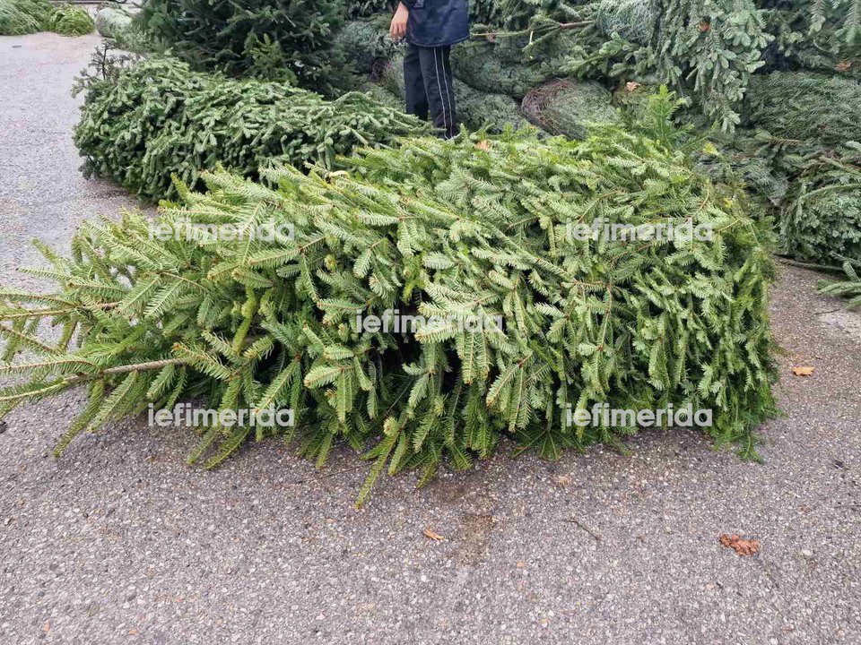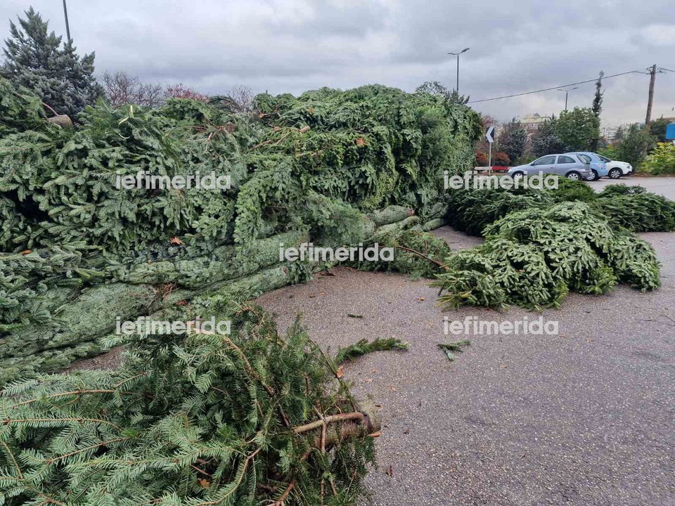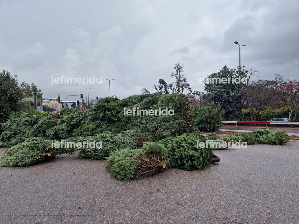 Σε κεντρικούς δρόμους της Αττικής, δίπλα στα τροχόσπιτα που έχουν στηθεί για την διαμονή των παραγωγών, τα έλατα σχηματίζουν μικρά βουνά πριν καταλήξουν σε σπίτια και καταστήματα.