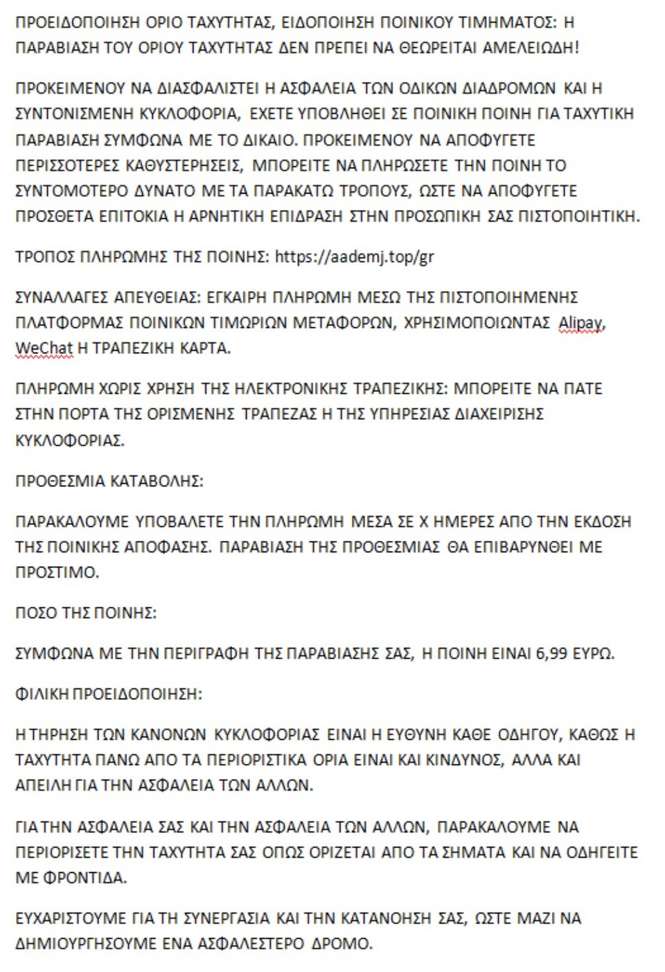 Με νέο μήνυμα SMS, που αποστέλλεται σε κινητά τηλέφωνα, επιτήδειοι προσπαθούν να εξαπατήσουν τους πολίτες μέσω ψευδών ειδοποιήσεων περί δήθεν επιβολής «ποινής» ή «προστίμου» για υπέρβαση ορίου ταχύτητας.