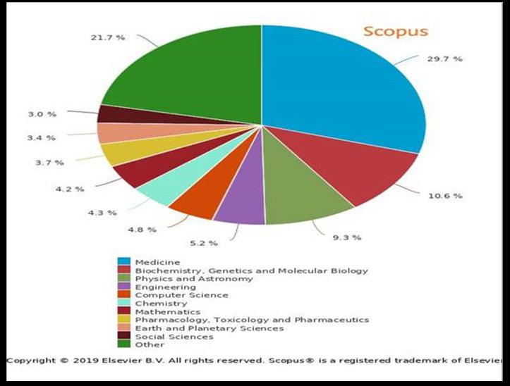- Όπως φαίνεται στο διάγραμμα 1, το οποίο έχει παραχθεί μέσα από τη βάση Scopus και παρουσιάζει την ποσοστιαία κατανομή ερευνητικών κειμένων του ΕΚΠΑ κατά επιστημονικό αντικείμενο, το 29,7% προέρχεται από τον χώρο της Ιατρικής. Ακολουθούν η Βιοχημεία-Γενετική & Μοριακή Βιολογία με 10,6% και η Φυσική & Αστρονομία με 9,3%