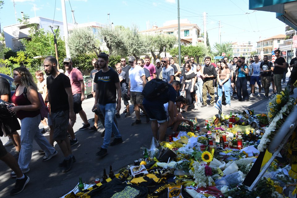 Λουλούδια στο σημείο της δολοφονίας του 29χρονου Μιχάλη Κατσουρή, στο γήπεδο της ΑΕΚ στη Νέα Φιλαδέλφεια, κατέθεσε σήμερα το πρωί αντιπροσωπεία της ΚΝΕ.