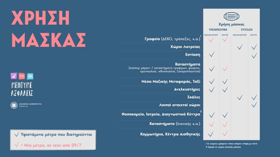 O επίσημος λογαριασμός της ελληνικής κυβέρνησης στο Twitter εξηγεί, με έναν πίνακα, πού επεκτείνεται η υποχρεωτική χρήση μάσκας για εργαζομένους και κοινό από την Τετάρτη 29/7.