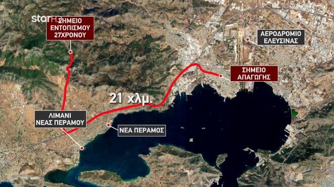 Σύμφωνα με πληροφορίες του τηλεοπτικού σταθμού Star, ο 27χρονος επιχειρηματίας απήχθη κάτω από το σπίτι του στην Ελευσίνα και βρέθηκε δολοφονημένος σε ρέμα στη Νέα Πέραμο. Οι δράστες φέρεται να ακολούθησαν μια διαδρομή περίπου 21 χιλιομέτρων, όπως φαίνεται και στον χάρτη που παρουσίασε το ίδιο Μέσο. Μάλιστα, στα τελευταία λεπτά της διαδρομής ο δρόμος φαίνεται κακοτράχαλος.