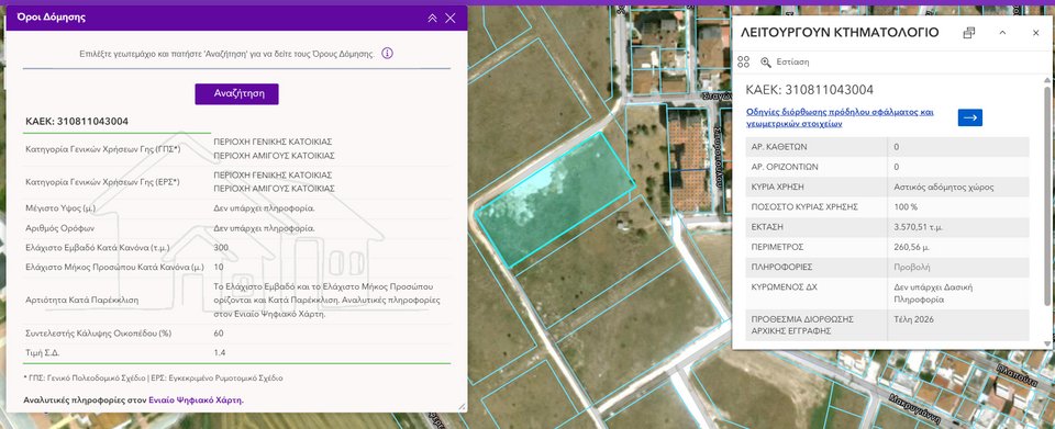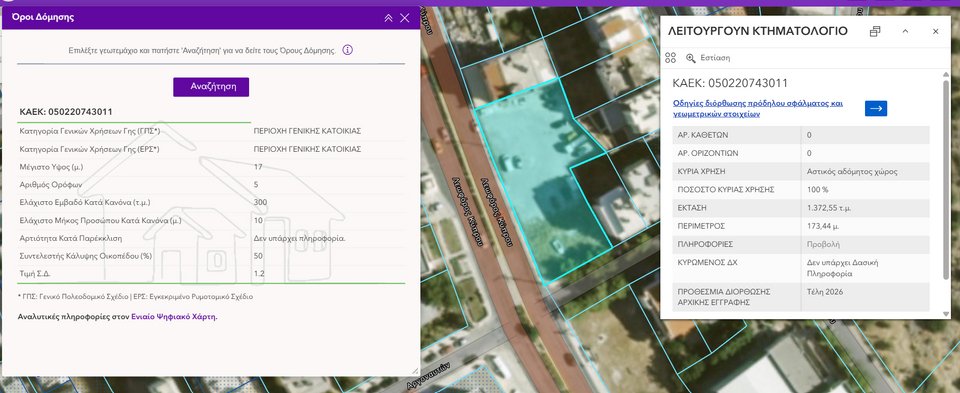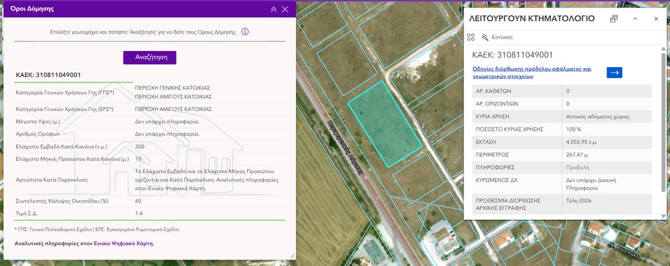 Η νέα αυτή λειτουργία λύνει τα χέρια σε πολίτες, μηχανικούς, επενδυτές και επαγγελματίες της αγοράς ακινήτων, καθώς τους δίνει τη δυνατότητα να αποκτούν άμεσα μια πρώτη αξιόπιστη εικόνα των πολεοδομικών δυνατοτήτων ενός ακινήτου.
