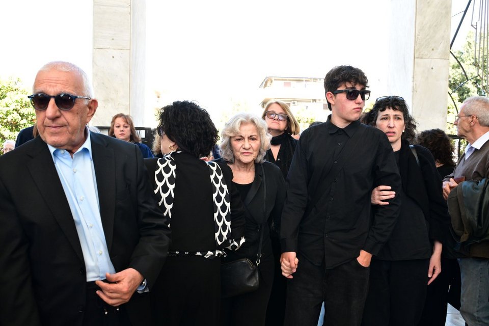 Συντετριμμένοι στην κηδεία, η Θεανώ Φωτίου, ο εγγονός της Δημήτρης και η σύντροφος του Βασίλη Ρίζου.