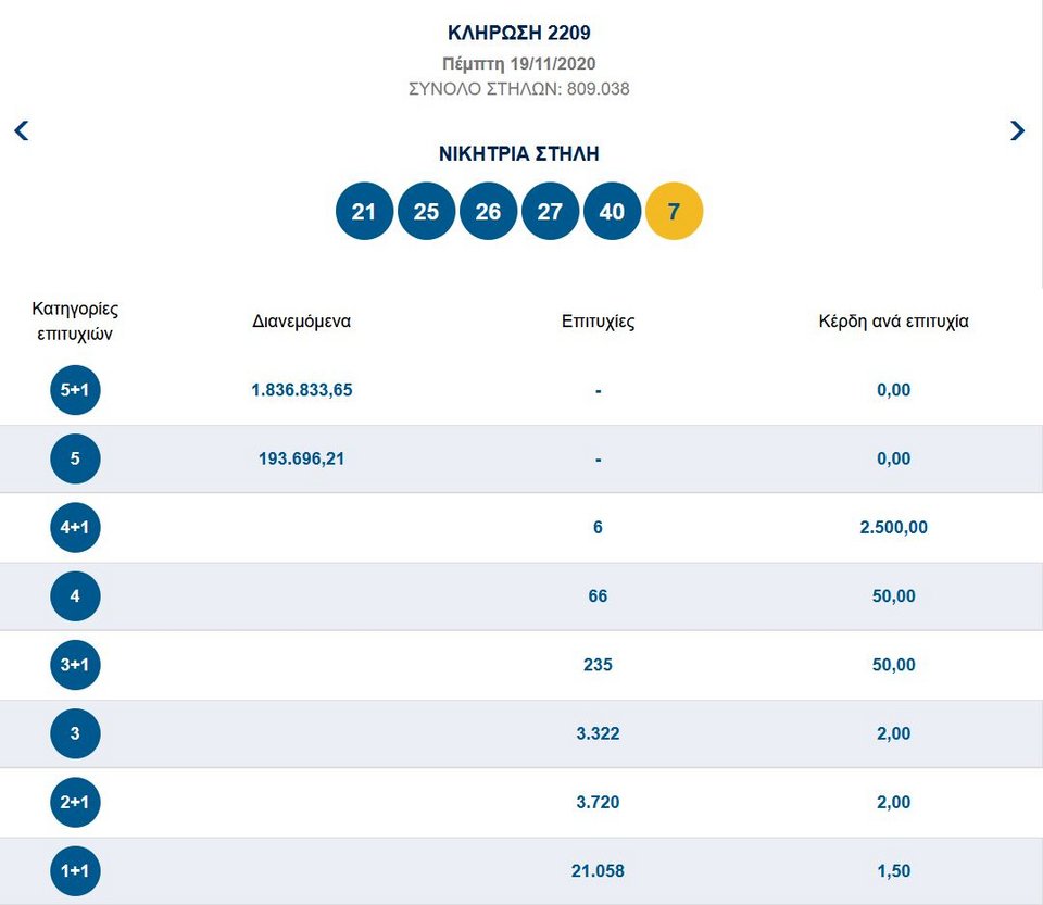 Οι τυχεροί αριθμοί είναι: 21, 25, 26, 27, 40 και αριθμός Τζόκερ το 7. Στην τρίτη κατηγορία έξι τυχεροί κέρδισαν 2.500 ευρώ. Στην κλήρωση της Κυριακής το Τζόκερ θα μοιράσει πάνω από 2.000.000 ευρώ.