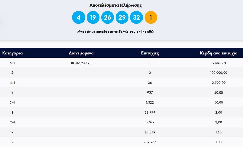 Οι αριθμοί σήμερα που κληρώθηκαν είναι οι εξής: 4, 19, 26, 29, 32 και τζόκερ ο αριθμός 1.
