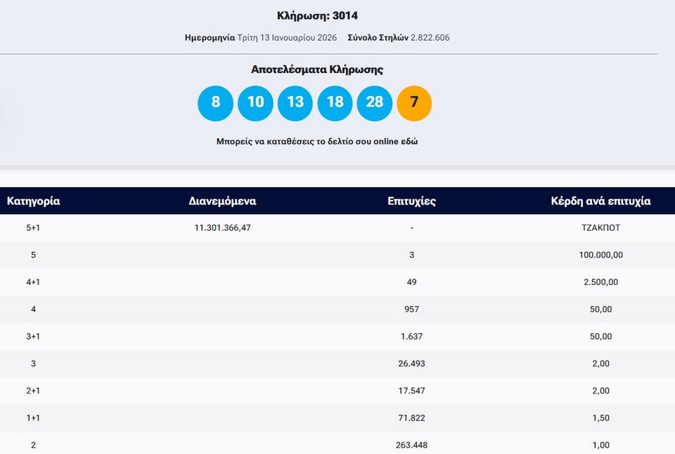 Οι αριθμοί που κληρώθηκαν είναι οι εξής: 8, 10, 13, 18, 28 και τζόκερ το 7.