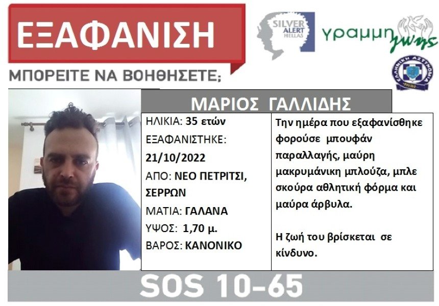 Όπως αναφέρουν στο Silver Alert οι οικείοι του, πρόκειται για τον 35χρονο Μάριο Γαλλίδη, ο οποίος το απόγευμα της 21/10/22 αποχώρησε από το σπίτι του, στο Νέο Πετρίτσι Σερρών και έκτοτε δεν έχει δώσει σημεία ζωής. Ο Μάριος έχει γαλανά μάτια, ύψος 1,70μ και είναι κανονικού βάρους.