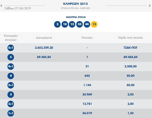 Οι τυχεροί αριθμοί που έβγαλε η κληρωτίδα είναι οι: 2, 10, 13, 33, 44 και Τζόκερ ο αριθμός 15.