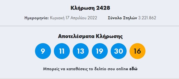 Οι τυχεροί αριθμοί του Τζόκερ είναι: 9 11 13 19 30 και Τζόκερ το 16.
