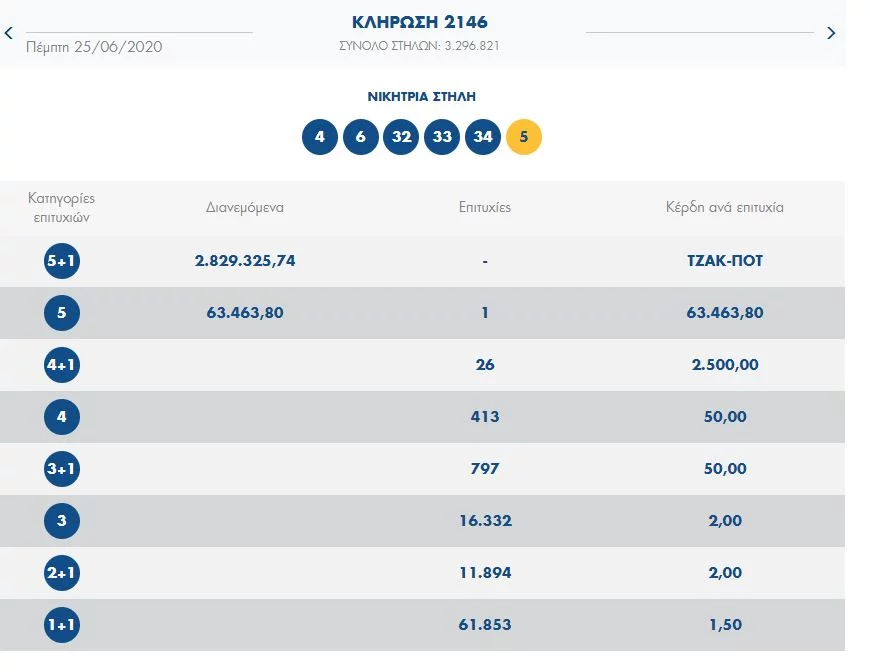 Οι τυχεροί αριθμοί της κλήρωσης του Τζόκερ, είναι οι εξής: 4, 6, 32, 33, 34 και Τζόκερ ο αριθμός 5.
