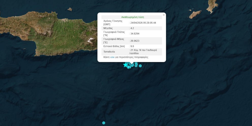 Σύμφωνα με το Γεωδυναμικό Ινστιτούτο του Εθνικού Αστεροσκοπείου Αθηνών, το επίκεντρο της δόνησης εντοπίζεται στον θαλάσσιο χώρο 21 χλμ. νότια του Γουδουρά Λασιθίου.
