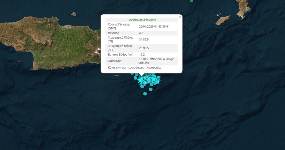 Ο σεισμός είχε επίκεντρο στο θαλάσσιο χώρο 21 χλμ. ΝΝΔ του Γουδουρά Λασιθίου και πρόκειται για ακόμα έναν μετασεισμό των 5,7 Ρίχτερ που σημειώθηκε χθες το πρωί στην Κρήτη.