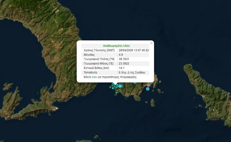 Σύμφωνα με το Γεωδυναμικό Ινστιτούτο Αθηνών, ο σεισμός ήταν μεγέθους 4,9 Ρίχτερ και σημειώθηκε στις 16:07, με επίκεντρο 8 χιλιόμετρα δυτικά της Σκιάθου.