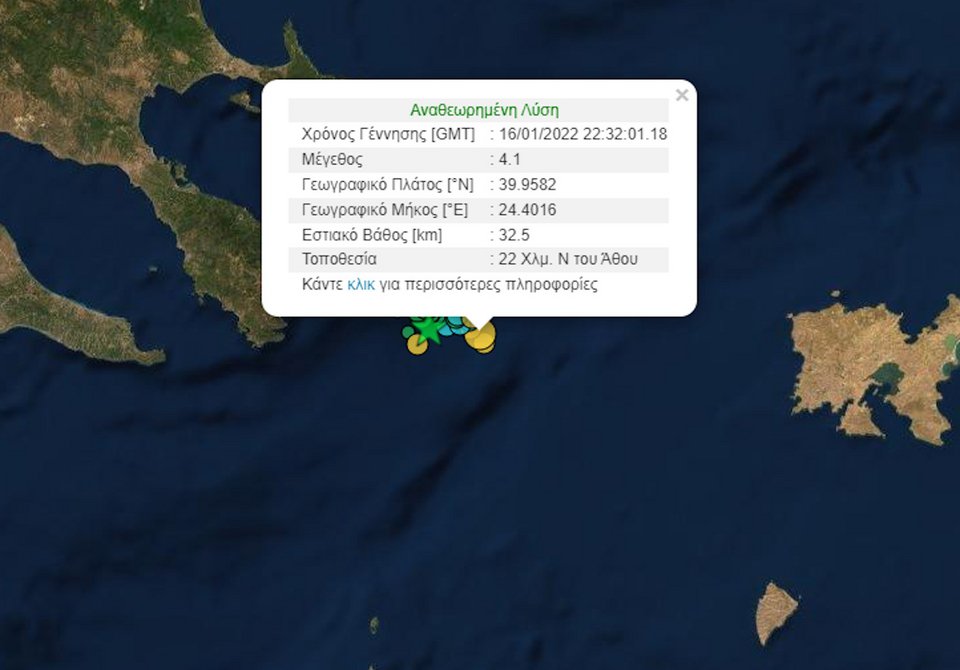 Νέος σεισμός, μεγέθους 4,1 Ρίχτερ, σημειώθηκε στις 00:32 στον θαλάσσιο χώρο ανοιχτά του Αγίου Όρους.