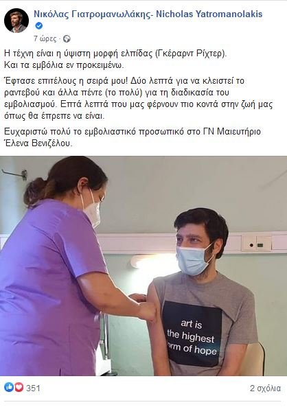 «Η τέχνη είναι η ύψιστη μορφή ελπίδας (Γκέραρντ Ρίχτερ). Και τα εμβόλια εν προκειμένω. Έφτασε επιτέλους η σειρά μου! Δύο λεπτά για να κλειστεί το ραντεβού και άλλα πέντε (το πολύ) για τη διαδικασία του εμβολιασμού. Επτά λεπτά που μας φέρνουν πιο κοντά στη ζωή μας, όπως θα έπρεπε να είναι. Ευχαριστώ πολύ το εμβολιαστικό προσωπικό στο ΓΝ Μαιευτήριο Έλενα Βενιζέλου», ανέφερε στην ανάρτηση που έκανε στο Facebook.