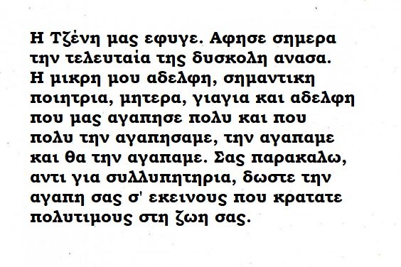 «Η Τζένη μας έφυγε. Αφησε σήμερα την τελευταία της δύσκολη ανάσα. Η μικρή μου αδελφή, σημαντική ποιήτρια, μητέρα, γιαγιά και αδελφή που μας αγάπησε πολύ και που πολύ την αγαπήσαμε, την αγαπάμε και θα την αγαπάμε. Σας παρακαλώ, αντί για συλλυπητήρια, δώστε την αγάπη σας σ' εκείνους που κρατάτε πολύτιμους στη ζωή σας».