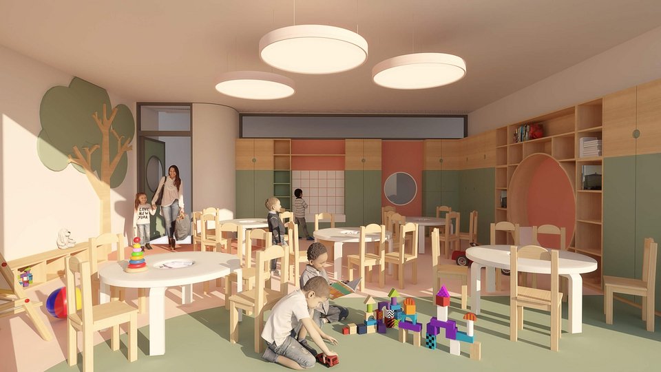 Οι χώροι, σχεδιασμένοι από το διεθνώς αναγνωρισμένο Γραφείο Τομπάζη, αξιοποιούν το φυσικό φως και έχουν διαμορφωθεί έτσι ώστε να προσκαλούν τα νήπια σε εξερεύνηση και παιχνίδι.
