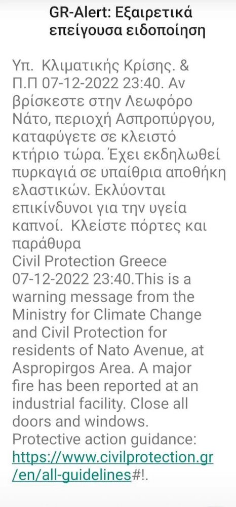 Προειδοποίηση από το 112 έλαβαν οι κάτοικοι των γύρω περιοχών ώστε να παραμείνουν στα σπίτια τους και να έχουν κλειστά πόρτες και παράθυρα.