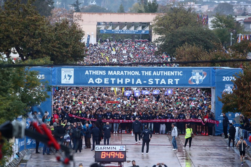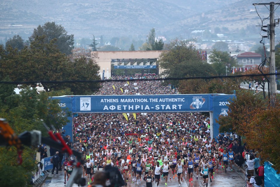 Η έντονη υγρασία και η πρωινή βροχή δεν πτόησαν τους 75.000 περίπου δρομείς που συμμετείχαν σήμερα στον Μαραθώνιο της Αθήνας.