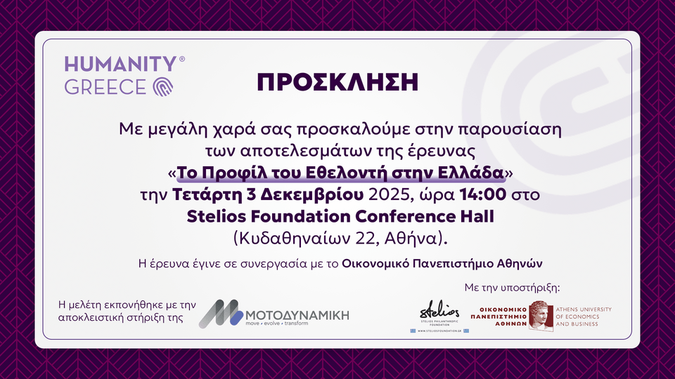 Ημερίδα «Το Προφίλ του Εθελοντή στην Ελλάδα» - Τετάρτη, 3 Δεκεμβρίου 2025,14:00 - Stelios Foundation Conference Hall (Κυδαθηναίων 22, Πλάκα)