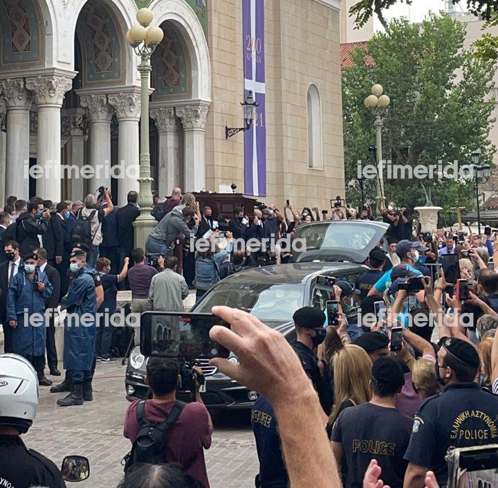 Το πλήθος που είχε συγκεντρωθεί έξω από τη Μητρόπολη ξέσπασε σε χειροκροτήματα. Σε κλίμα βαθιάς συγκίνησης, ο κόσμος αποχαιρετούσε τον κορυφαίο δημιουργό φωνάζοντας «αθάνατος», ενώ δεν εγκατέλειψε το σημείο ακόμα και όταν ξεκίνησε η βροχή.