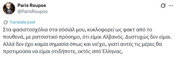 «Στα φασιστοσχόλια στα σόσιάλ μου, κυκλοφορεί ως φακτ από το πουθενά, με ρατσιστικό πρόσημο, ότι είμαι Αλβανός. Δυστυχώς δεν είμαι», σημείωσε.