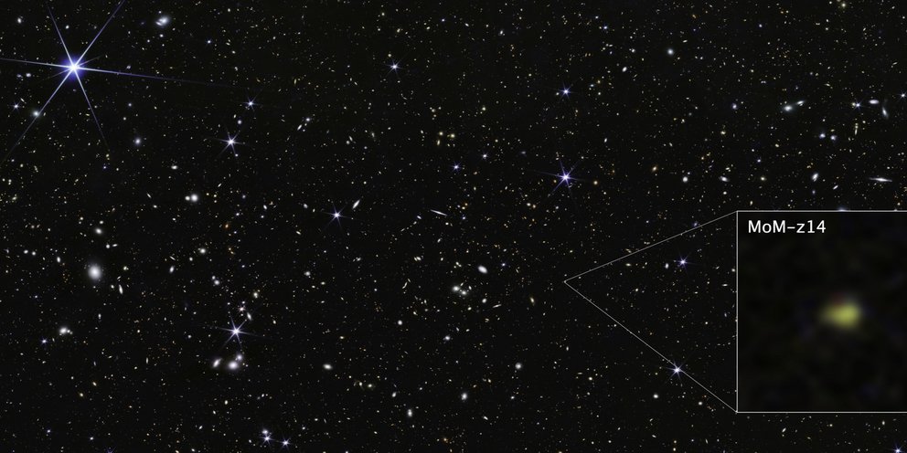 Χρησιμοποιώντας το όργανο NIRSpec (Φασματογράφος Εγγύς Υπέρυθρου) του James Webb, οι αστρονόμοι επιβεβαίωσαν ότι το φως του γαλαξία MoM-z14 ταξιδεύει μέσα στον διαστελλόμενο χώρο, επιμηκυνόμενο και «μετατοπιζόμενο» προς μεγαλύτερα, πιο ερυθρά μήκη κύματος, για περίπου 13,5 από τα εκτιμώμενα 13,8 δισεκατομμύρια χρόνια ύπαρξης του Σύμπαντος.