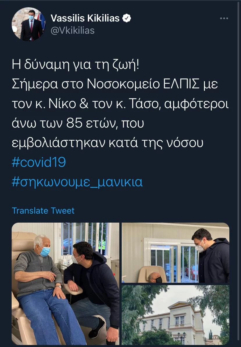 «Η δύναμη για τη ζωή! Σήμερα στο νοσοκομείο ΕΛΠΙΣ με τον κ. Νίκο και τον κ. Τάσο, αμφότεροι άνω των 85 ετών που εμβολιάστηκαν κατά της νόσου» έγραψε ο υπουργός Υγείας Βασίλης Κικίλιας στο twitter του.