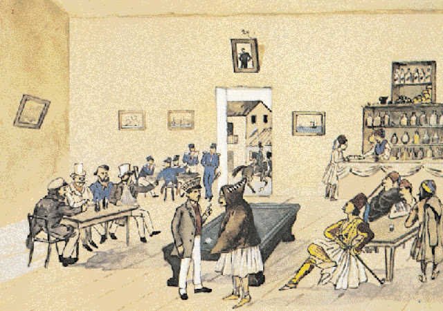 Για την ώρα, ταυτόχρονα με την Ωραία Ελλάδα λειτουργεί στην Αθήνα και πάλι στην Αιολική Οδό -αυτή τη φορά στη διασταύρωση με τη σημερινή Μητροπόλεως- στο ισόγειο της οικίας Τζαβέλλα, το «Καφενείο των Αγωνιστών». Κατά το Ελληνικό Λογοτεχνικό και Ιστορικό Αρχείο, πρόκειται για στέκι με έντονη μυρωδιά της Ανατολής, όπου συχνάζουν κυρίως φουστανελοφόροι του απελευθερωτικού αγώνα, καπνίζοντας ναργιλέ, παίζοντας πρέφα και εξιστορώντας τα κατορθώματά τους. Εδώ συγκεντρώνονται και στρατιωτικοί που μετά το τέλος του Αγώνα και την έλευση των Βαυαρών βρίσκονται έξω από το στράτευμα. Το καφενείο αυτό αποτελεί το θερμοκήπιο, όπου καλλιεργείται η Μεγάλη Ιδέα.
