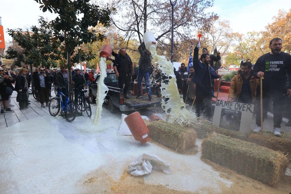 Αγρότες έχυσαν γάλα μπροστά στο Δικαστικό Μέγαρο Λάρισας