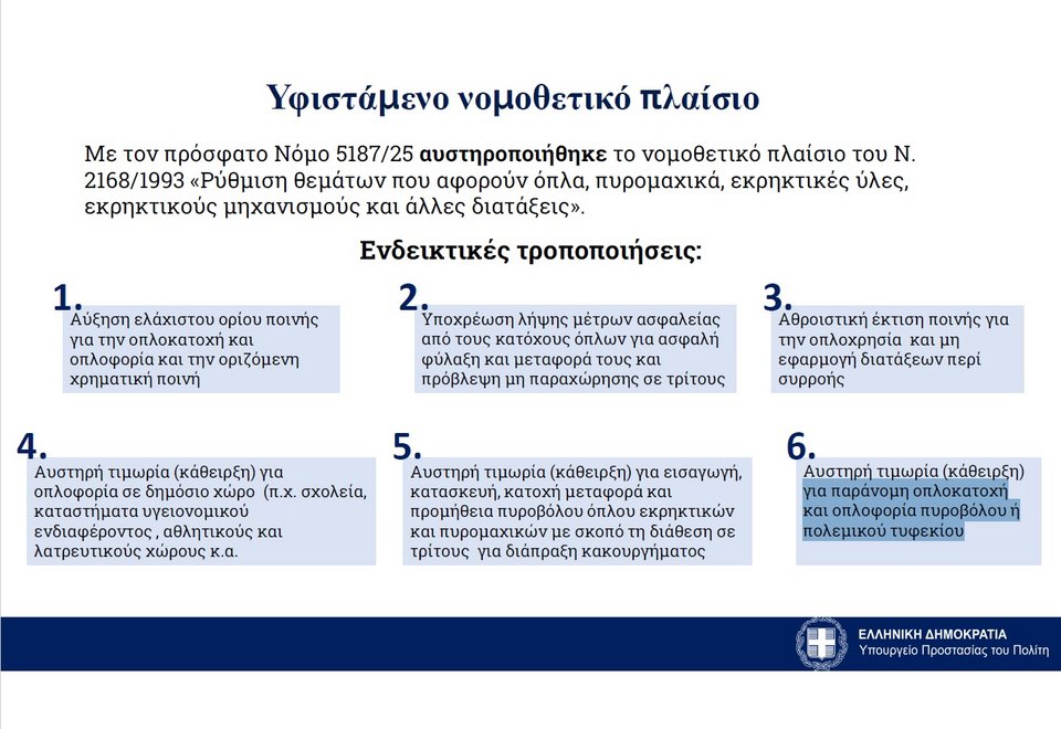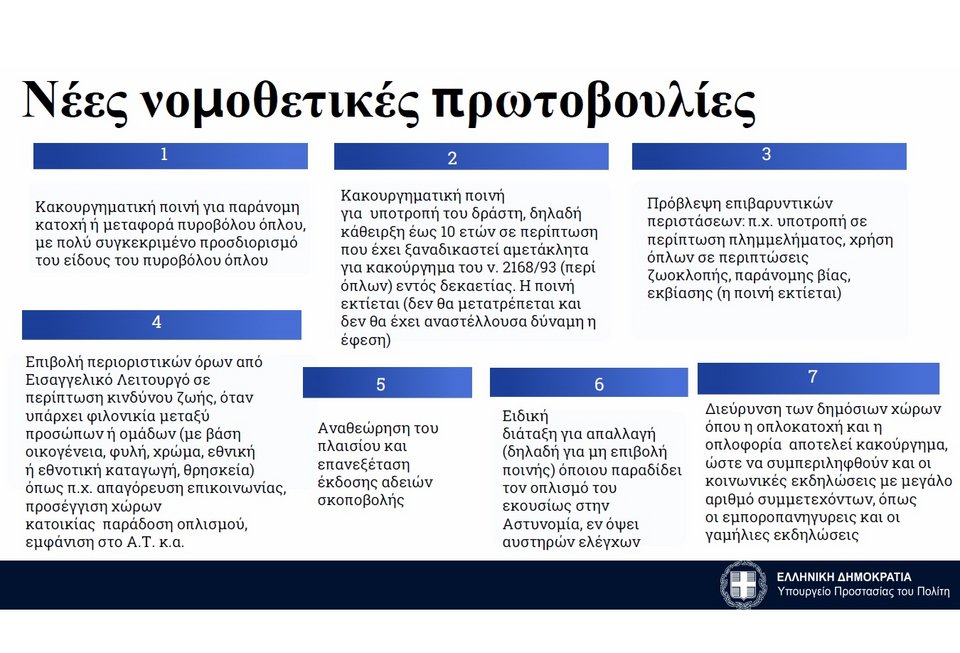 Σύμφωνα με τις ανακοινώσεις του υπουργού Προστασίας του Πολίτη, τα πιστόλια, τα περίστροφα και παρόμοια όπλα προστίθενται στη διάταξη που αφορά την παράνομη οπλοκατοχή και οπλοφορία πυροβόλων ή πολεμικών τυφεκίων. Πλέον, η οπλοφορία με πιστόλια και περίστροφα θεωρείται κακούργημα.