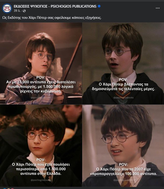 Με μία χιουμοριστική ανάρτηση στα social media, οι Εκδόσεις Ψυχογιός, που έφεραν στην χώρα μας τα βιβλία του Χάρι Πότερ, απάντησαν, λοιπόν, στα όσα ακούστηκαν τις τελευταίες ημέρες με αφορμή την κυκλοφορία του βιβλίου του Αλέξη Τσίπρα.