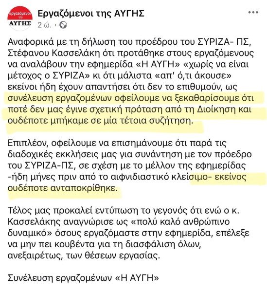 «Αναφορικά με τη δήλωση του προέδρου του ΣΥΡΙΖΑ- ΠΣ, Στέφανου Κασσελάκη ότι προτάθηκε στους εργαζόμενους να αναλάβουν την εφημερίδα «Η ΑΥΓΗ» «χωρίς να είναι μέτοχος ο ΣΥΡΙΖΑ» κι ότι μάλιστα «απ’ ό,τι άκουσε» εκείνοι ήδη έχουν απαντήσει ότι δεν το επιθυμούν, ως συνέλευση εργαζομένων οφείλουμε να ξεκαθαρίσουμε ότι ποτέ δεν μας έγινε σχετική πρόταση από τη Διοίκηση και ουδέποτε μπήκαμε σε μία τέτοια συζήτηση.