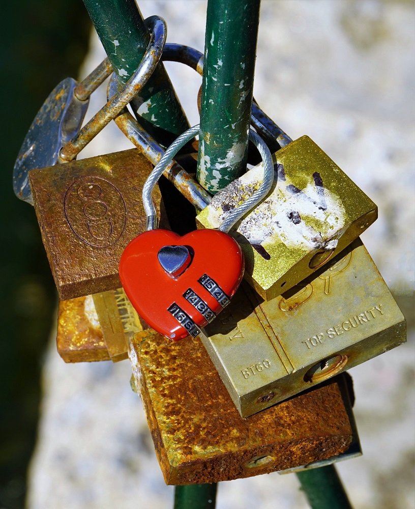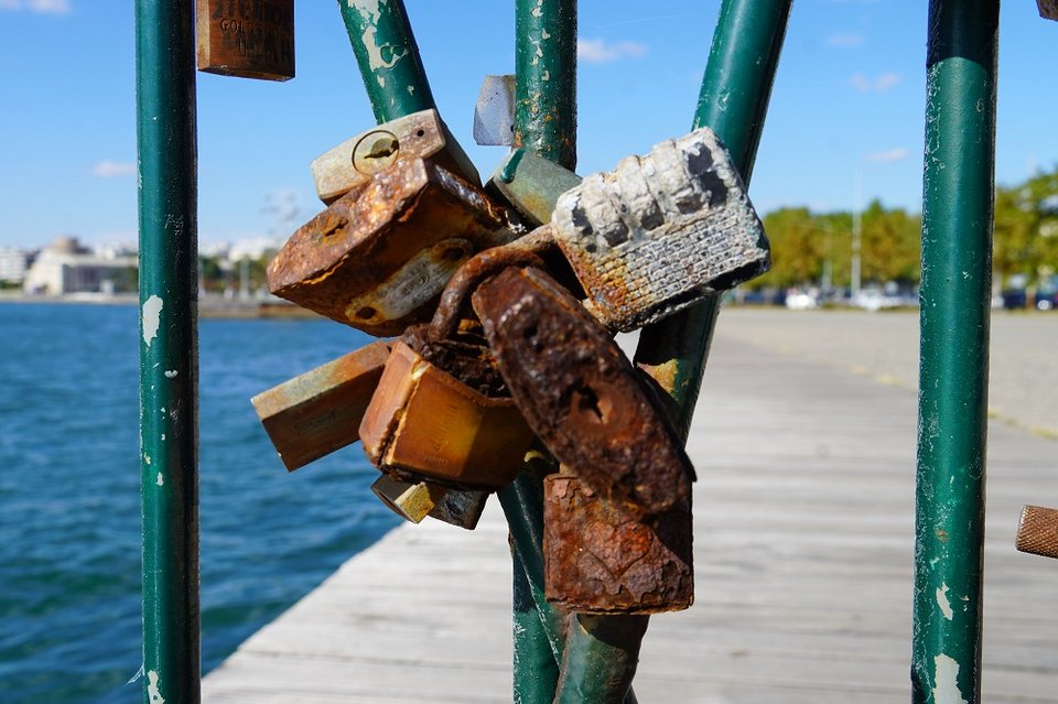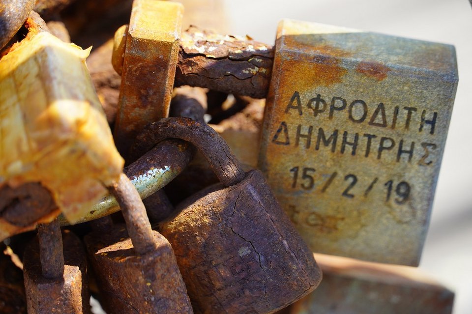 Μια κλειδαριά με έντονη προσωπικότητα, παρά την προχωρημένη "σήψη" της είναι αυτή που από τον λαιμό της κρέμεται ένας κρίκος κι από αυτόν κρέμονται δύο μεταλλικές καρδούλες, επίσης σκουριασμένες. Εικόνα που προκαλεί τρυφερότητα μα και συγκίνηση.