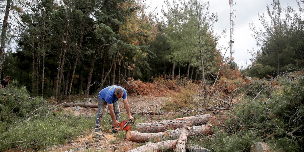 Στο όρος Βόιο και σε υψόμετρο 1300 μέτρων, υλοτόμοι της περιοχής ξυλεύουν μια συστάδα δάσους αγριοβελανιδιάς.
