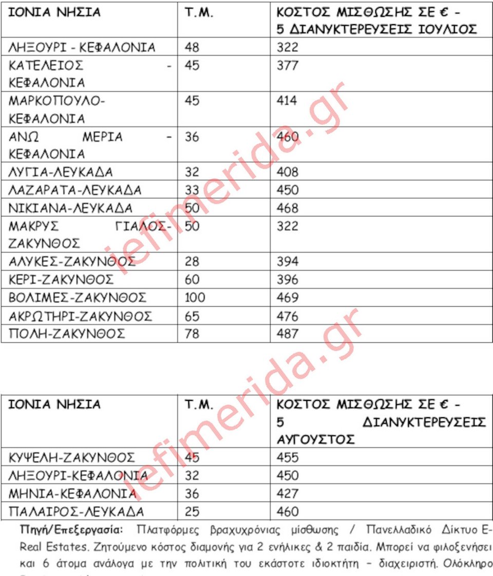 Οι προ-κρατήσεις για ακίνητα με κόστος διανυκτέρευσης έως 100€ για τον Ιούλιο στο σύνολο των Ιονίων νήσων κυμαίνεται στο 95% και για τον Αύγουστο στο 99%. Η διαθεσιμότητα «περιορίζεται» κυρίως σε ακίνητα από 30τμ έως 50τμ, κυρίως σε προορισμούς της Κεφαλονιάς, της Λευκάδας και της Ζακύνθου.