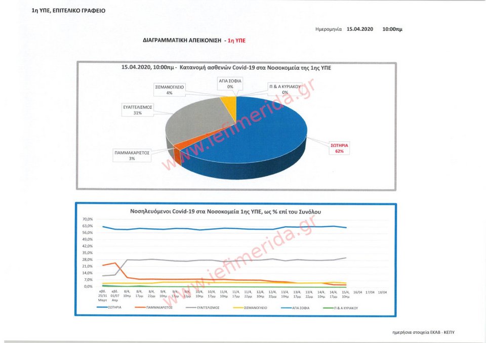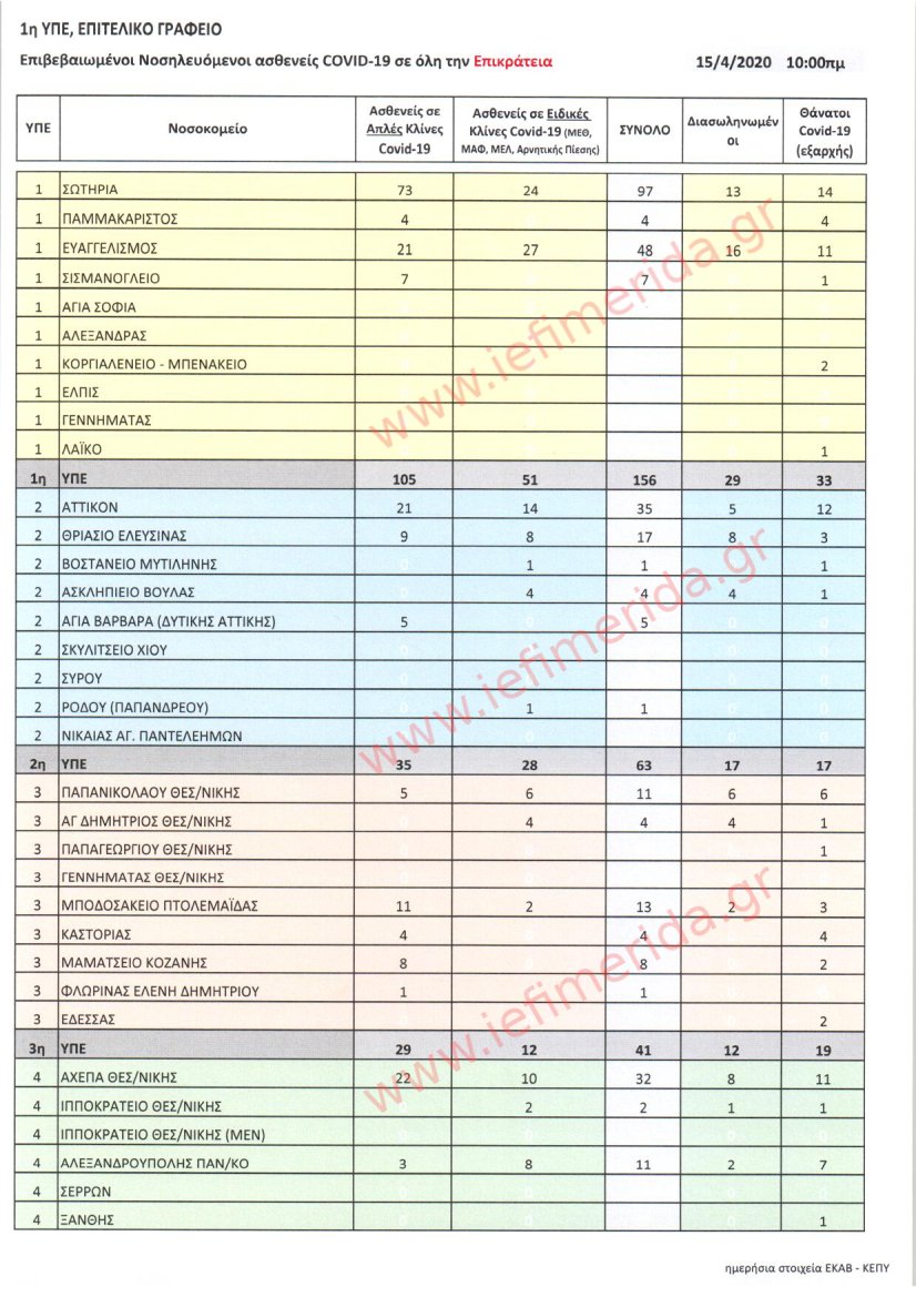 Τα στοιχεία αυτά – ενημερωμένα μέχρι χθες, Μ. Τετάρτη - δείχνουν σε κάθε νοσοκομείο της χώρας ανά Υγειονομική Περιφέρεια, τους ασθενείς. Πόσοι νοσηλεύονται σε απλές κλίνες, πόσοι σε ειδικές κλίνες (ΜΕΘ, θαλάμους αρνητικής πίεσης κλπ), πόσοι διασωληνωμένοι και πόσοι έχουν καταλήξει από τον φονικό ιό από την αρχή της πανδημίας στην Ελλάδα.